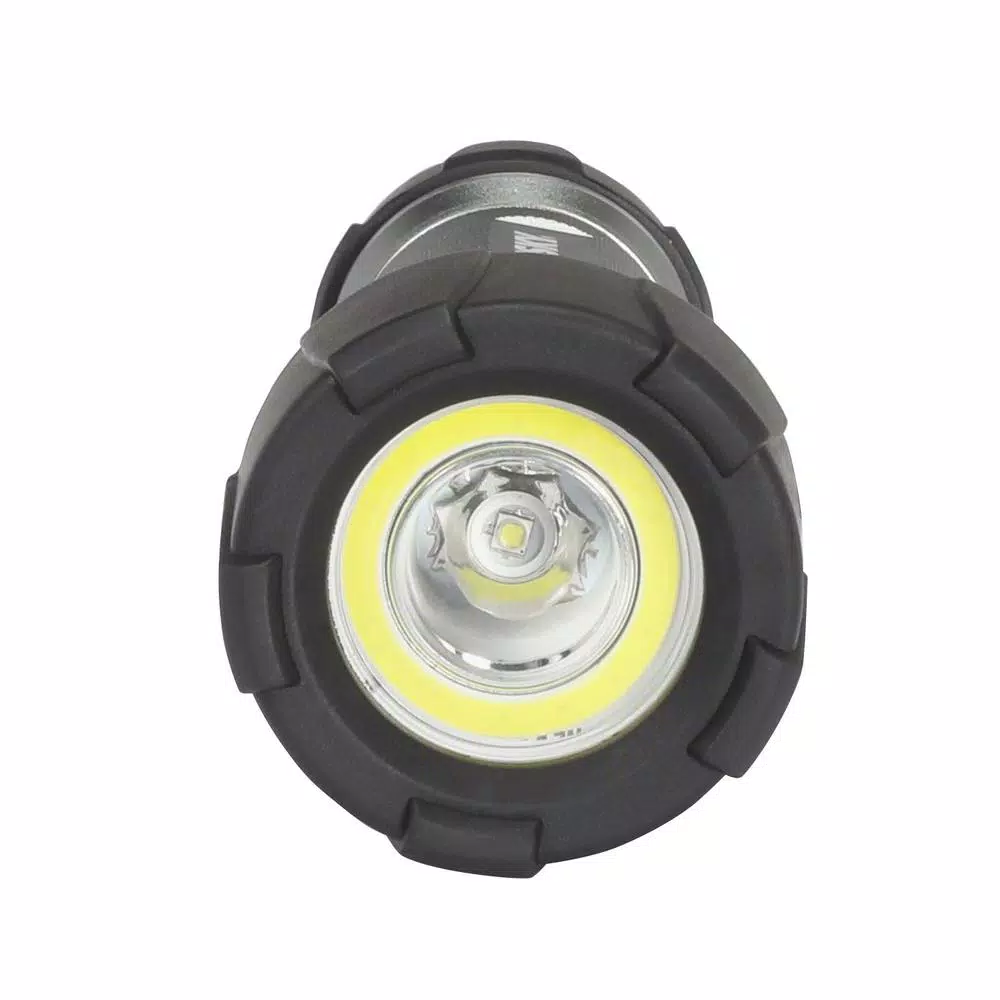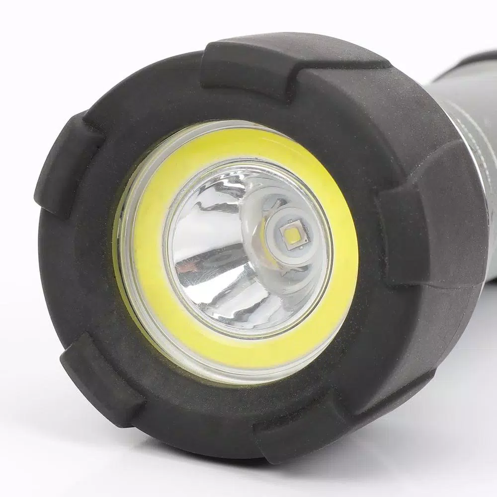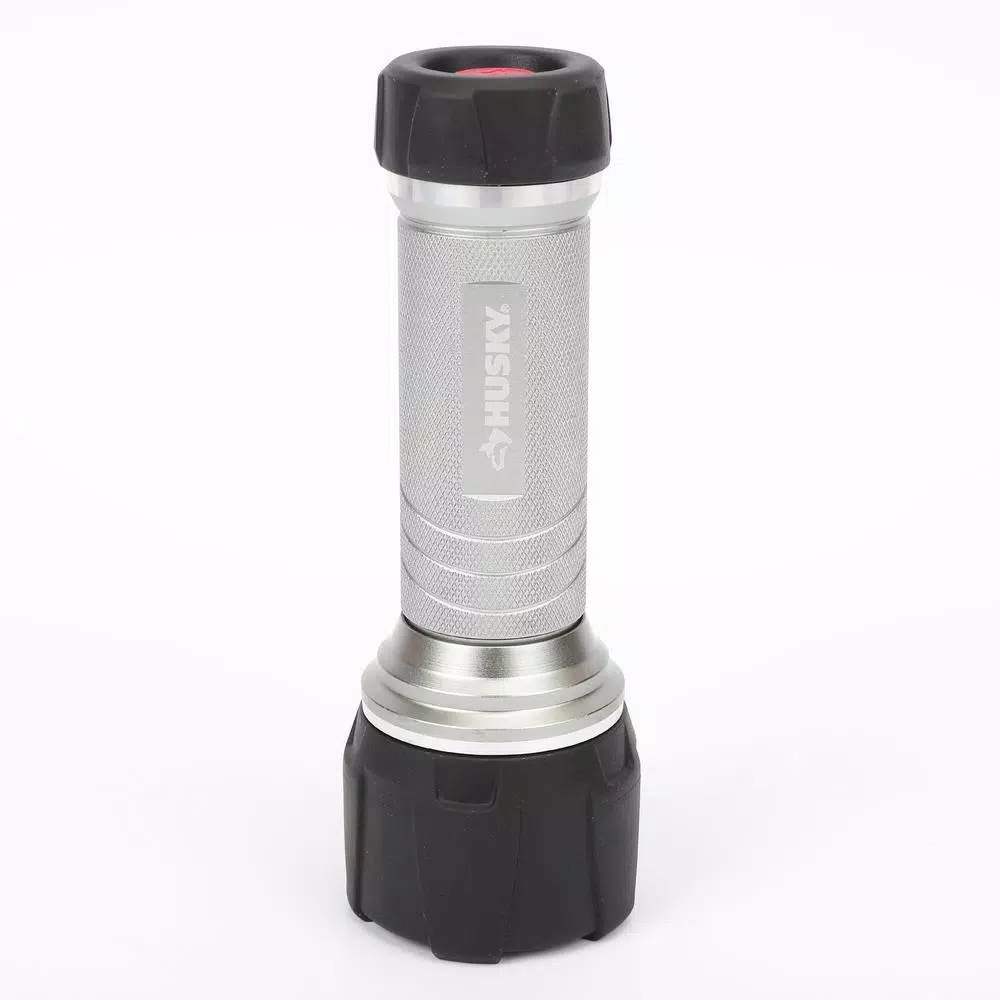The Husky 350-Lumen Dual beam unbreakable Flashlight features durable aluminum. With high power LED and COB chip for wide range lighting. The light provides 3 modes of operation, spot, flood, both spot and flood. Drop test rated from 30 ft. and waterproof to 1 m. It is with super bright LED and Energizer Alkaline battery is included, up to 350-Lumen.