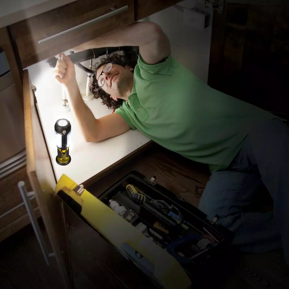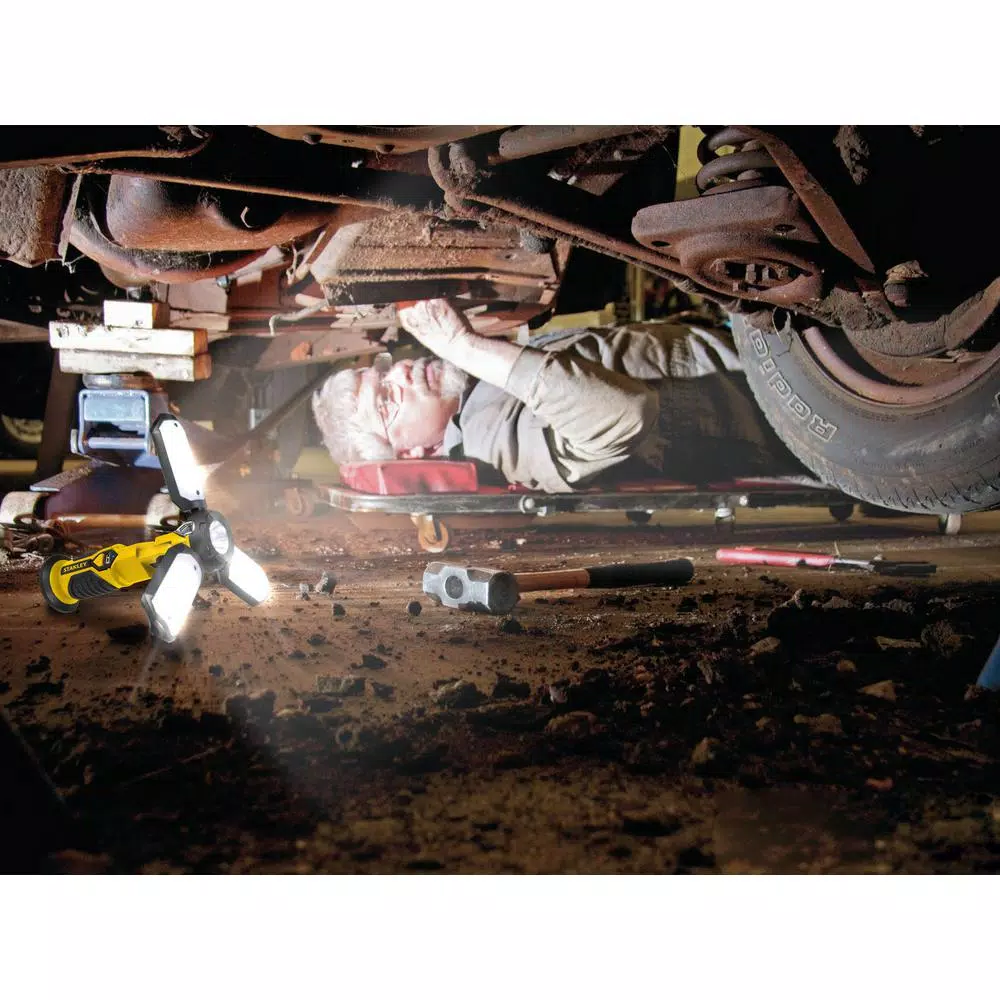 Get flexible, hands-free illumination with the Stanley SAT3S rechargeable work light. With a pivoting head, 3 fold-out LED panels and a magnetic base, you can light up even the darkest and most cramped of workspaces with up to 300 powerful Lumens. The included lithium-ion battery gives you up to 6-hours of long-lasting illumination on lower settings, so you’ll always have enough light to last until the job is done. There’s also a 2-way USB port, allowing the light to act as a portable power station for your cell phone or tablet computer, while also giving it the ability to charge up using common USB cables.