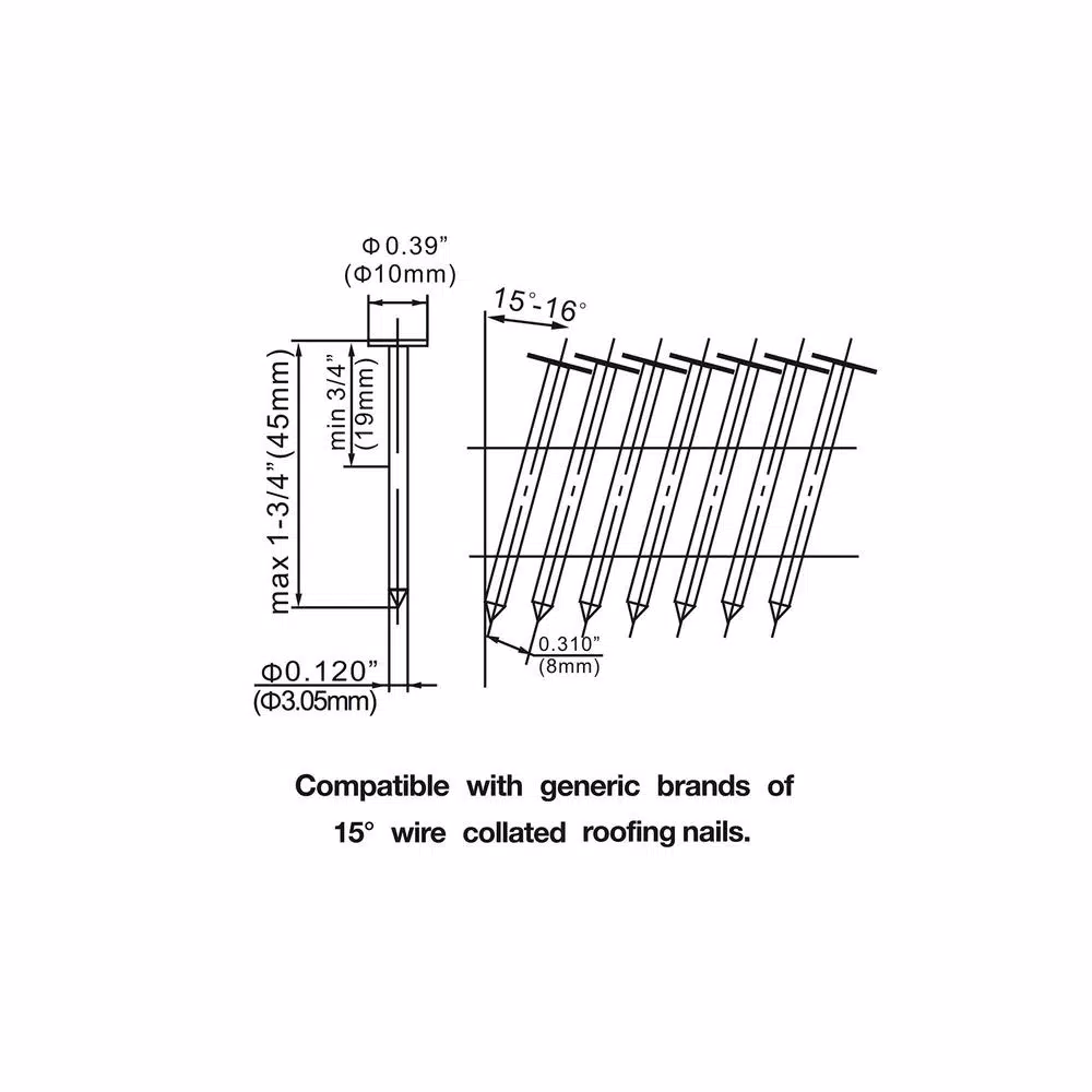 - Compatible with 15° wire collated roofing nails from 3/4 in. to 1-3/4 in.