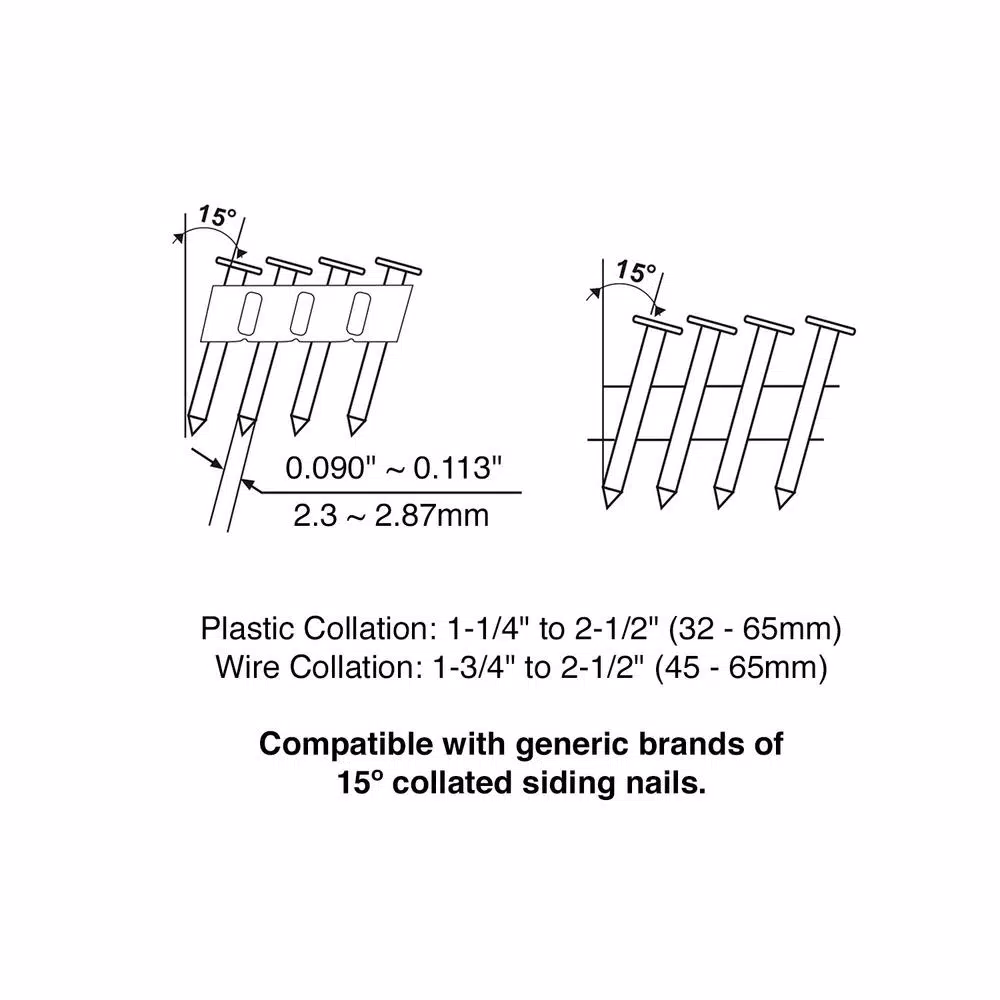 - Compatible with 15 degree plastic collated coil siding nails from 1-1/4 in. to 2-1/2 in., and 15 degree wire collated coil siding nails from 1-3/4 in. to 2-1/2 in. (diameter 0.09 in. to 0.113 in.)