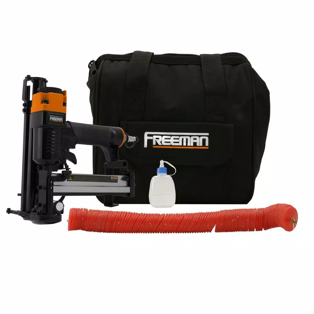 The Freeman PPCS Pneumatic 18-Gauge 1-1/4 in. Plastic Cap Stapler with Canvas Bag and Plastic Cap Staples (1000 count) saves significant time and effort for professionals and DIYers working on jobs requiring the installation of weather resistant barriers. This specialized pneumatic stapler is a huge step up from manual installation for projects needing plastic caps, such as house wrap, roofing felt and foam board insulation. Protection from the elements is improved considerably when using this round cap stapler and the risk of hammering thumbs and fingers when doing this by hand is eliminated altogether. It has a comfort grip handle for less fatigue and more control and an ergonomically engineered body making it a lightweight tool ideal for extended use and increased productivity. The anodized aluminum magazine increases the life of this durable staple gun, and the bottom loading stapler is easy to reload on the fly — minimizing downtime at the work site. It is compatible with Bostich 5/16 in. crown staples ranging from 3/4 in. L to 1-1/4 in. L. This specialized stapler also comes with a convenient protective canvas carrying bag, adjustment tools, lubrication oil, belt hook, 1,000 count plastic caps and 1,000 count 18-Gauge 5/16 in. crown staples with a 1 in. L. Designed with the professional in mind, the Pneumatic 18-Gauge 1-1/4 in. Plastic Cap Stapler is covered by Freeman’s 7-year Limited Warranty and 90-Day Wearable Parts Warranty.