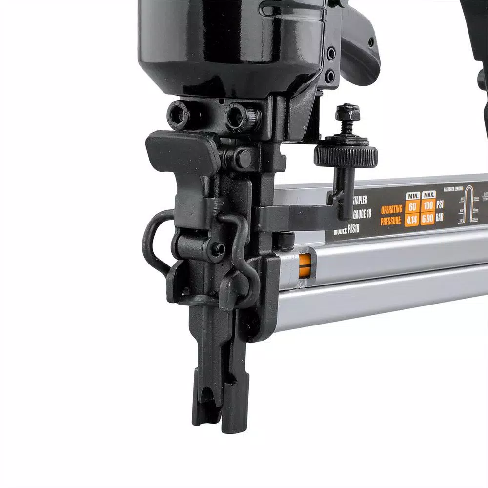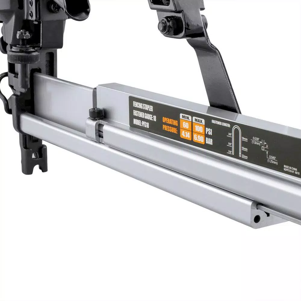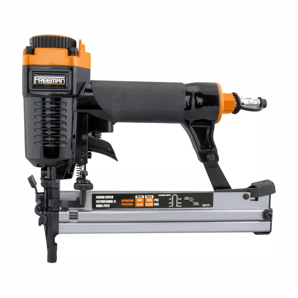 The Freeman PFS18 Pneumatic 18-Gauge 7/8 in. Fencing Stapler is an excellent choice for mesh and woven applications such as electrified single wire with insulation, vineyard trellising, snow control fencing, pet enclosures and livestock fencing. This rugged air powered staple gun is designed for sequential firing and is compatible with 18-Gauge fencing staples from 3/8 in. to 7/8 in. A quick jam release provides easy access to the drive blade in the event of a jammed fastener and changing the depth of the fencing staples is also accomplished quickly and without tools by turning a wheel near the trigger. A 1-piece drive blade and anodized aluminum cylinder and magazine extend the life of this lightweight and durable tool. Other features include a convenient reload window to see when fencing staples are running low and a simple pull-back pusher to avoid delays when reloading. A comfort grip handle helps reduce operator fatigue and increase control, particularly useful when working for long stretches of time. The Pneumatic 18-Gauge 7/8 in. Fencing Stapler will save you time completing fencing projects and is covered by Freeman’s 7-Year Limited Warranty and 90-Day Wearable Parts Warranty.