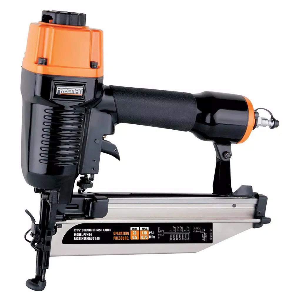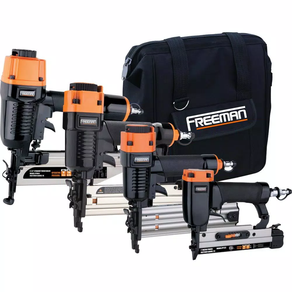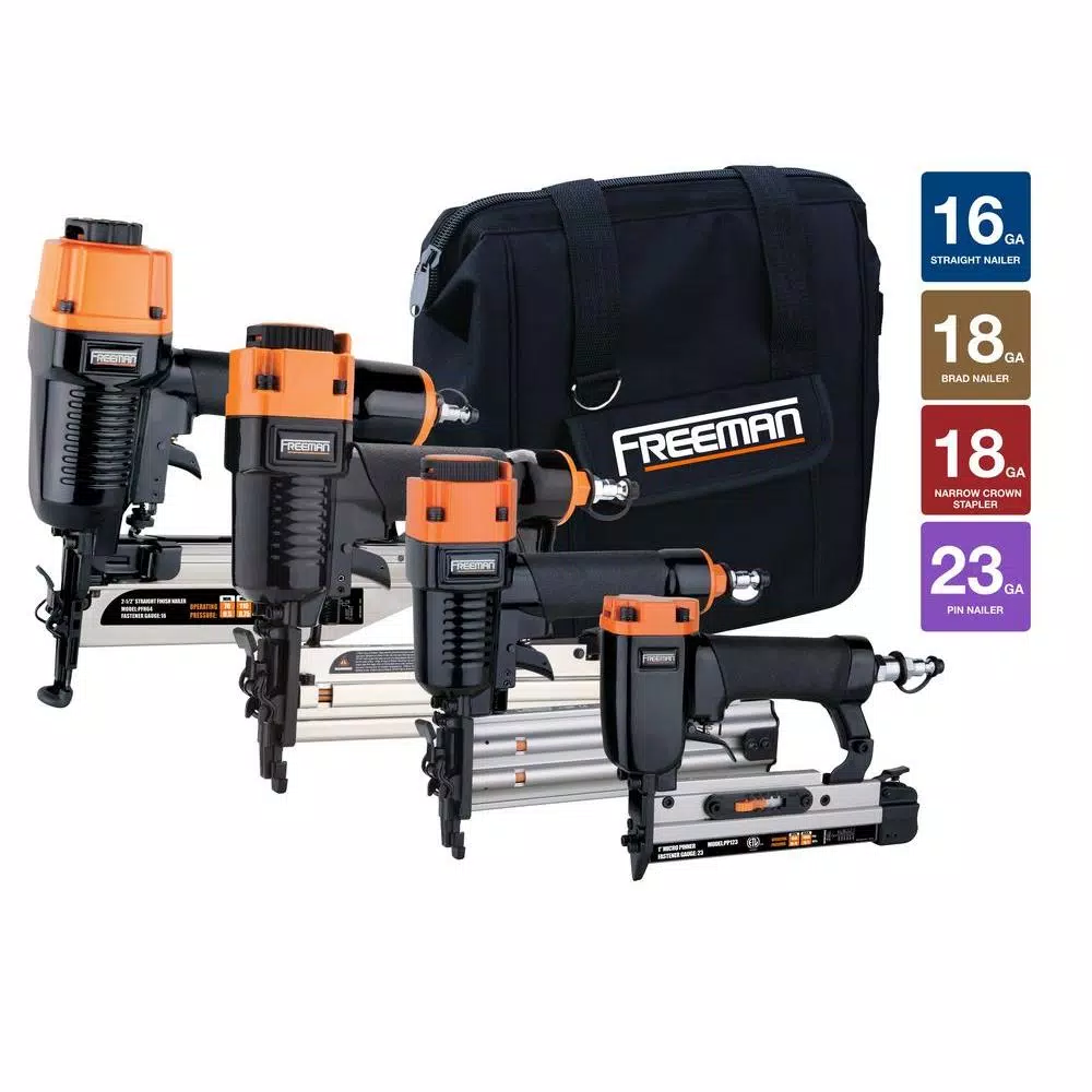 The Freeman P4FNCB Pneumatic Finishing Nailer Combo Kit with Canvas Bag and Fasteners (4-Piece) is an incredible collection of tools for DIY home improvement and repair projects as well as professional contractor jobs. This kit covers all your finishing needs with durable and rugged air powered tools that complete a wide span of applications. The 16-Gauge 2-1/2 in. Straight Finish Nailer (PFN64) is perfect for moulding, chair rails, door casing, as well as cabinetry and furniture construction. Use the 18-Gauge 1-5/8 in. Narrow Crown Stapler with Quick Jam Release (PST9040Q) ideal for handling decorative trim, cabinet backing, and hobbies and crafts. The 18-Gauge 2 in. Brad Nailer with Quick Jam Release (PBR50Q) is ideal for interior and exterior finish and trim, furniture, cabinetry, and picture frame assembly. Top it off with the 23-Gauge 1 in. Micro Pinner (PP123), specifically designed for applications such as tacking decorative trim, glazing strips, jewelry cases, small picture frames, and cabinetry trim. Lubrication oil, adjustment wrenches, safety goggles, belt hooks, and 200 fasteners for each tool are included, along with a convenient canvas carry bag. The Pneumatic Finishing Nailer Combo Kit with Canvas Bag and Fasteners (4-Piece) will allow you to get right to work on finish jobs, and is covered by Freeman’s 7-year Limited Warranty and 90-day Wearable Parts Warranty.