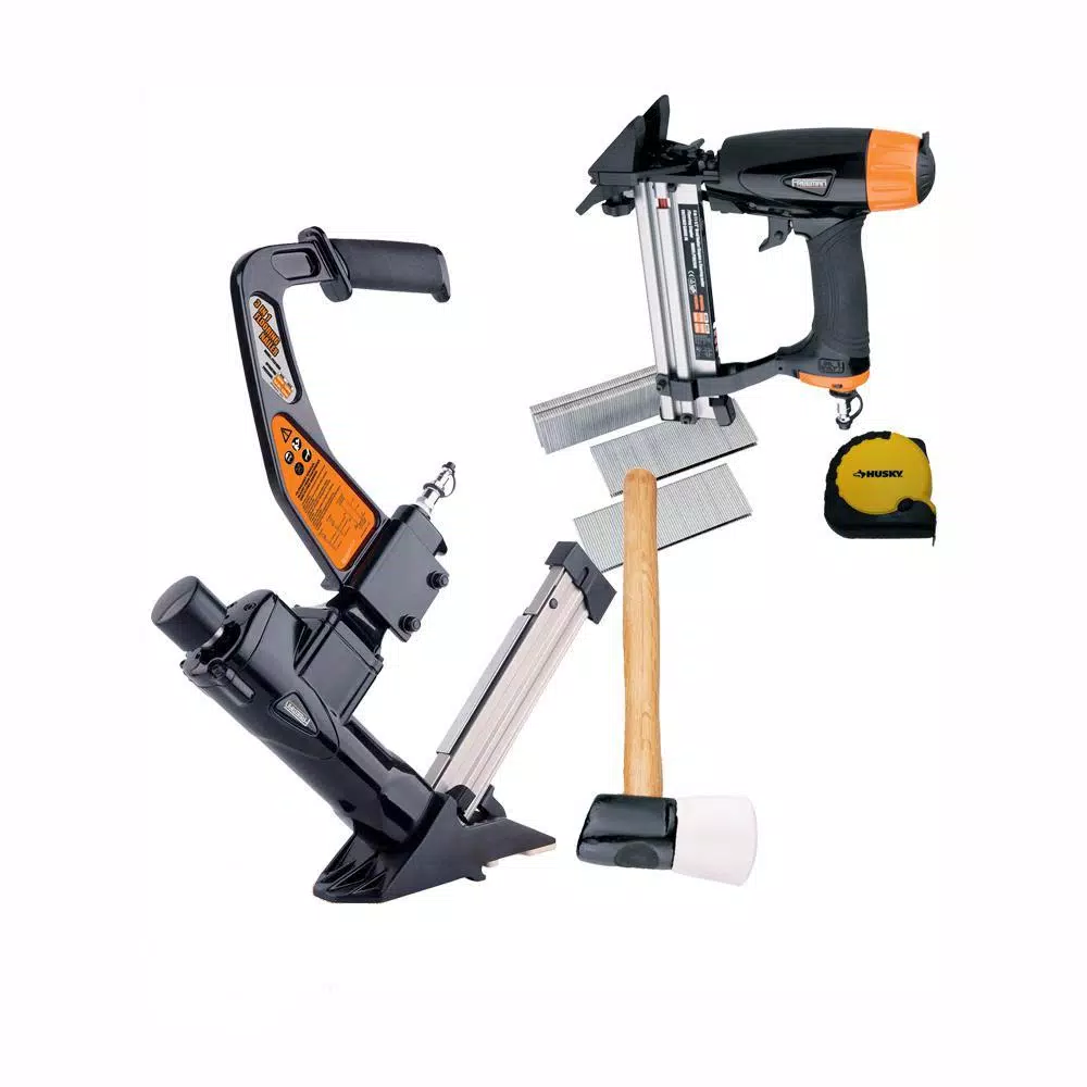 - Kit includes a wooden handle flooring mallet with a rubber head, nails for each nail gun (1000 count 16-Gauge 2 in. L-cleats, 1000 count 18-Gauge 1/4 in. narrow crown staples 1/2 in. L), 16 ft. tape measure, 2 interchangeable base plates, air tool oil, and adjustment tools