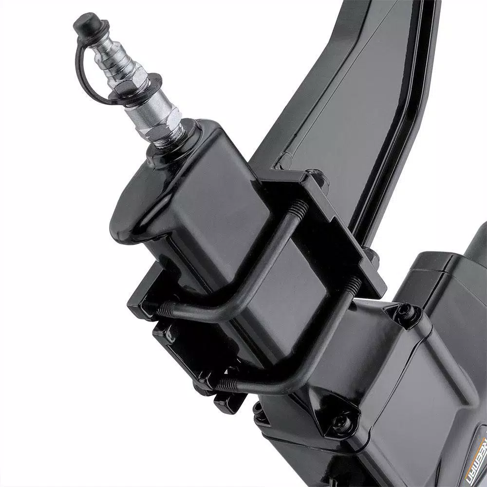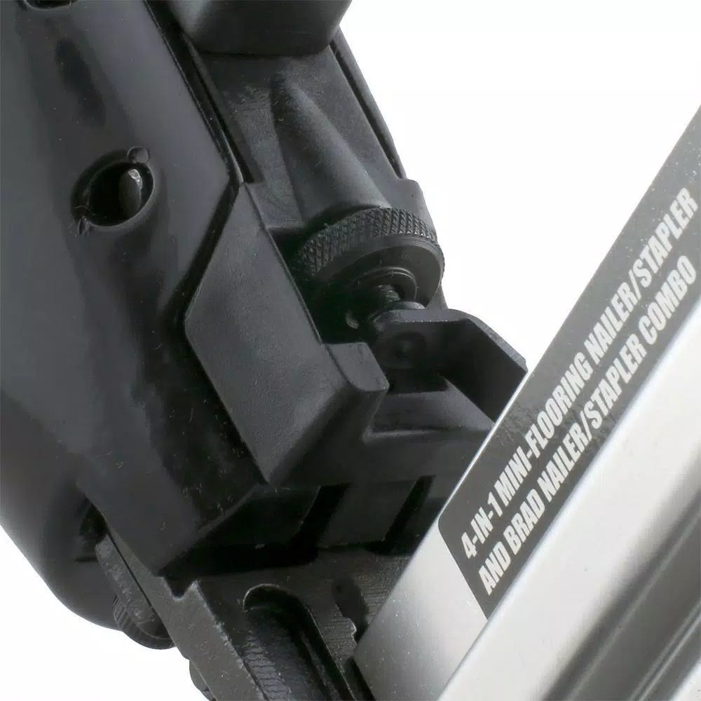 - 4-in-1 mini flooring nailer and stapler: tool-free depth adjust, anodized aluminum cylinder and magazine, 1-piece drive blade, oil free design, ergonomically engineered body, comfort grip handle, 360° adjustable exhaust, air filter/anti-dust cap