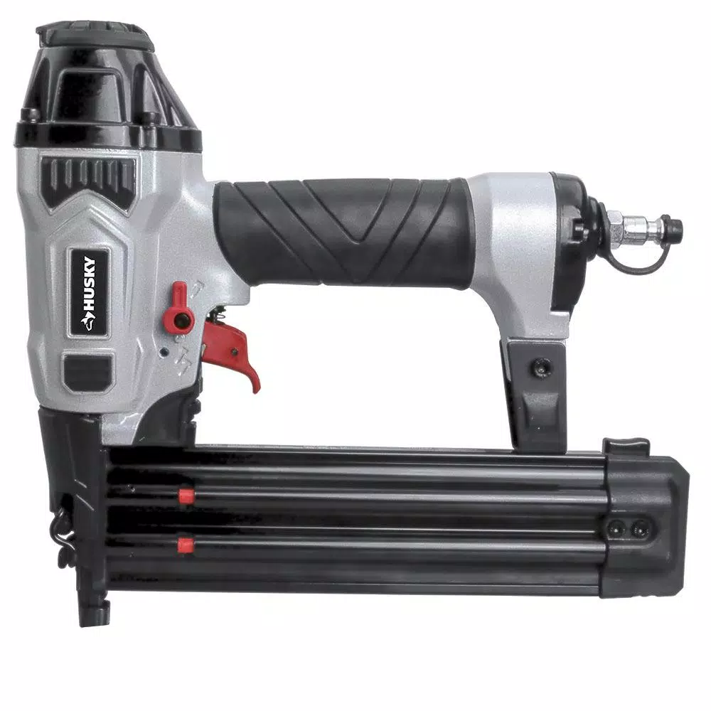 The Husky DPBR50 Pneumatic 18-Gauge 2 in. Brad Nailer is great for working on trim, finish, furniture, cabinetry and crafts. This air powered nail gun is compatible with 18-Gauge brad nails from 3/8 in. to 2 in. This rugged nailer features a 1-piece steel drive blade for long-lasting durability. The oil-free operation eliminates the risk of staining a project while a dust cap, and an internal air filter keeps the tool free of debris. A padded grip ensures comfortable operation. The Pneumatic 18-Gauge 2 in. Brad Nailer is perfect for DIYers at home and professional construction contractors at the job site, and is covered by Husky’s 2-Year Limited Warranty.
