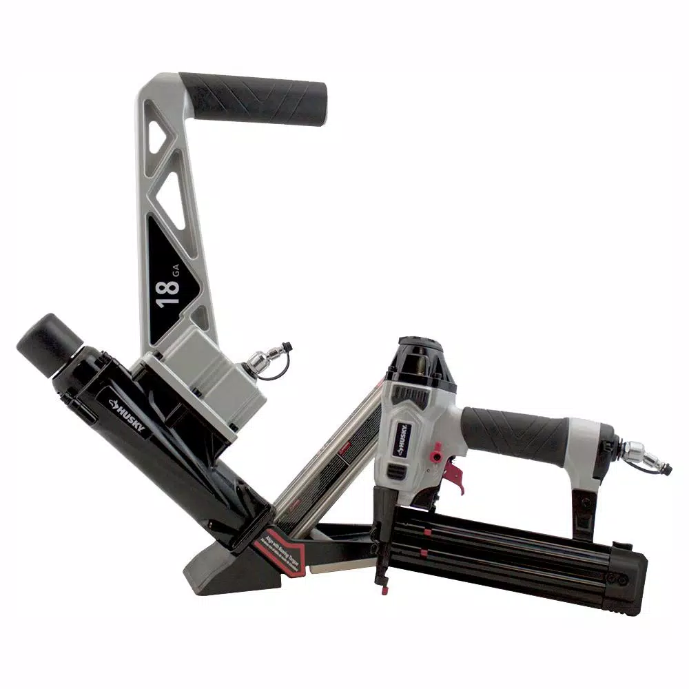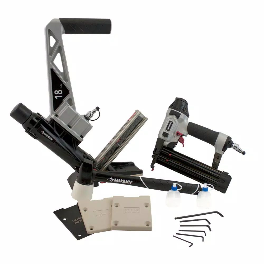 The Husky 2-Piece 18-Gauge Engineered and Exotic Flooring Nailer/Brad Nailer combo kit is an all in one purchase for your engineered or dense and exotic, like Stranded Bamboo, tongue and groove hardwood flooring installation project. The 18-Gauge L-cleat flooring nailer allows you to choose from any brand of 18ga L flooring cleats ranging from 1/4 in. to 3/4 in. L. Multiple base plates allow you to easily and safely install your tongue and groove flooring, unfinished OR pre-finished flooring ranging from 3/8 in. to 3/4 in. thick. The Brad nailer included will allow you to quickly go from your flooring install, to the finishing touches of your trim work, shooting 18-Gauge brad nails ranging 5/8 in. to 2 in. L. The Husky Flooring nailer is equipped with premium features such as a no mar tip to prevent scratching of the floor, a fiberglass handle, non-marring mallet, swivel air connector, die cast aluminum body and more. Your brad nailer is equipped with a comfort grip, quick release nose for tool free jam clearing, a no mar tip and more. Husky nailers are backed by a 2-year warranty.