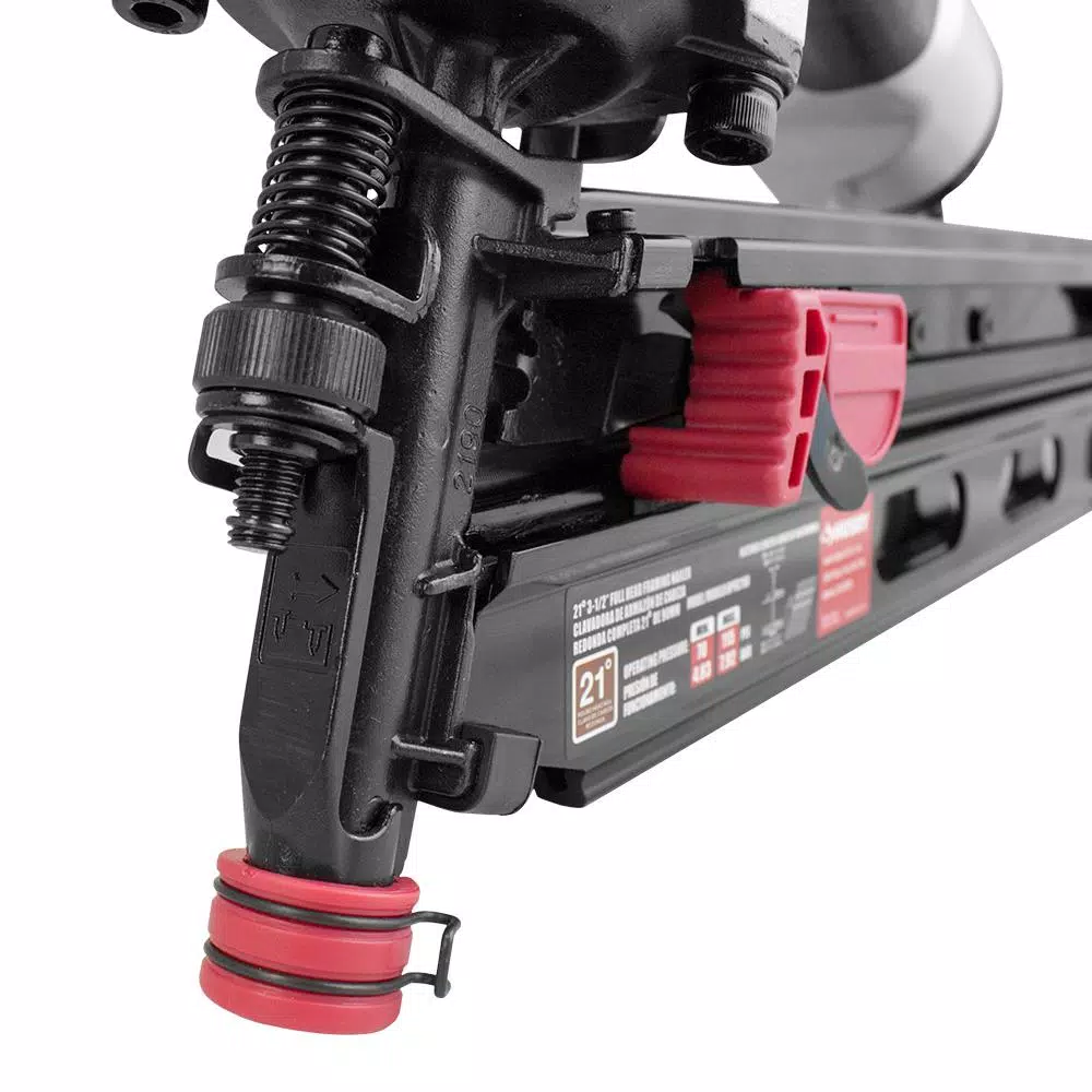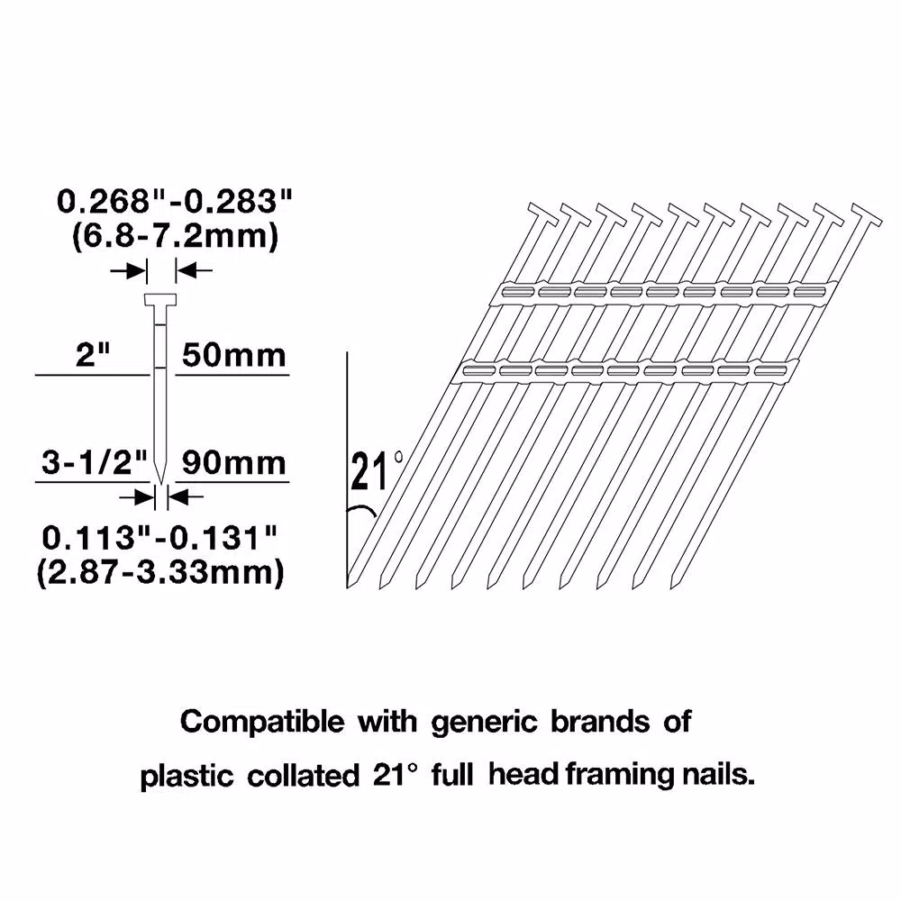 The Husky DPFR2190 Pneumatic 21° 3-1/2 in. Full Round Head Framing Nailer is ideal for your next framing, sheathing, remodeling or decking project. This air powered nail gun drives 20°-22° plastic collated full round head framing nails from 2 in. to 3-1/2 in. This rugged tool has die cast magnesium construction for lightweight usability on a variety of projects. Other features of this framing nailer include a select fire trigger to easily switch from sequential fire to bump fire mode, a tool-free depth adjust and a removable no mar tip to protect your work surface. An anti-dry-fire mechanism prevents you from shooting blanks when the nail quantity is low, protecting the internal components of the nail gun. Simply load another strip of nails into the magazine and get back to work. Air tool oil and adjustment tools are included. The Pneumatic 21° 3-1/2 in. Full Round Head Framing Nailer will increase the productivity of DIYers at home as well as professional contractors at the job site, and is covered by Husky’s 2 Year Limited Warranty.