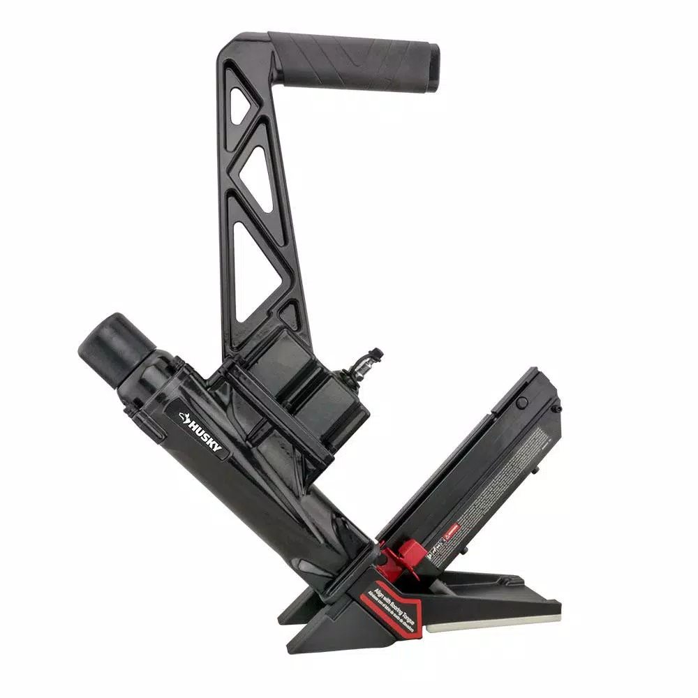 The Husky HDUFL50 Pneumatic 3-in-1 15.5-Gauge and 16-Gauge 2 in. Flooring Nailer and Stapler with Quick Jam Release is specifically designed for the installation of tongue and groove hardwood flooring. This air powered flooring nailer and stapler is compatible with 16-Gauge L-cleats, T-cleats, and 15.5-Gauge 1/2 in. crown staples from 1-1/2 in. to 2 in. for all 3 types of fasteners. 3 interchangeable base plates are included and allow you to install flooring from 5/8 in. to 3/4 in. Upgraded with a quick jam release in the foot, you can clear jammed fasteners fast and easy and get right back to work. This rugged flooring nailer/stapler combo is constructed of high strength aluminum and heat treated steel parts, making it lightweight and durable. A no mar base provides protection from damage to finished flooring surfaces, ensuring professional results for DIYers as well as construction contractors. The comfort grip handle helps reduce fatigue and increase control when using for long spans of time. A fiberglass mallet with a replaceable rubber head and padded grip, air tool oil, and adjustment tools are included. The Pneumatic 3-in-1 15.5-Gauge and 16-Gauge 2 in. Flooring Nailer and Stapler with Quick Jam Release comes at a fraction of the cost of 3 separate flooring nailers, will significantly increase your productivity, and is covered by Husky’s 2-Year Limited Warranty.