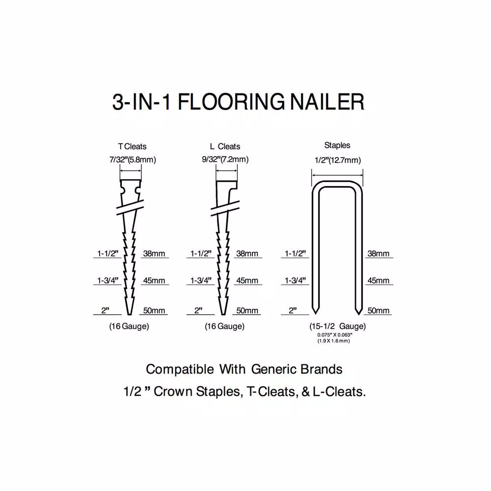 - Compatible with 16-Gauge L-cleats and T-cleats, and 15.5-Gauge 1/2 in. crown staples from 1-1/2 in. to 2 in. for all 3 types of fasteners
