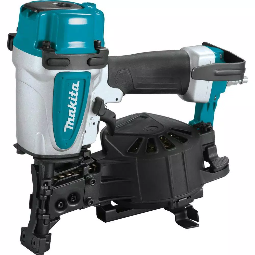 The Makita 1-3/4 in. Roofing Coil Nailer (model AN454) combines rugged construction and robust performance with less weight (only 5.2 lbs.). The AN454 accepts standard 0.120 shank diameter coil roofing nails from 3/4 in. to 1-3/4 in. nails in length. The AN454 is engineered for longer tool life with durable and lightweight aluminum housing and an easy-loading adjustable canister. Ease-of-use features include a “tool-less” depth adjustment engineered for more precise control and flush nailing. Additional features include large carbide inserts on the nosepiece for long lasting performance. Oversized steel wear plates are engineered to reduce abrasion on the tool.