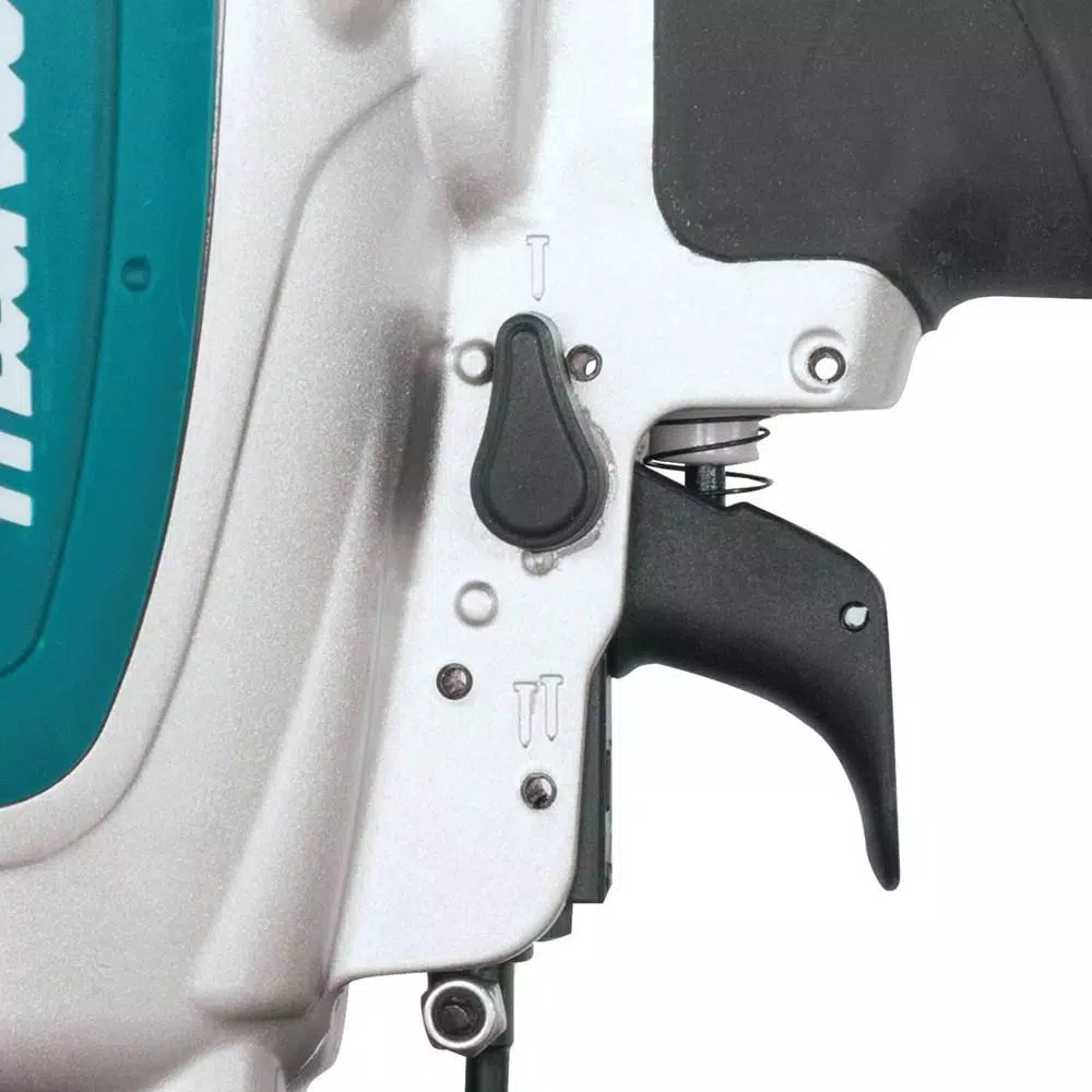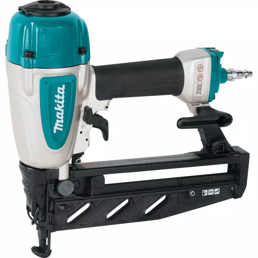 The Makita 16-Gauge Straight Finish Nailer combines a myriad of features and powerful performance in a compact size. It has a rear-loading magazine that accepts standard 16-Gauge. straight finish nails sized 1 in. to 2-1/2 in. The nail lock-out and large windows alert the user when to reload nails as the contact arm and trigger are used together for controlled firing. With a compact size and weighing in at only 3.8 lbs., the Makita 16-Gauge Straight Finish Nailer was engineered for all-day professional use. Additional convenience features include a reversible belt hook that allows the tool to remain close-by, a multi-directional exhaust port that directs exhaust air away from the user, a built-in air duster that provides convenient air flow to clear your workspace and a 2-mode selector switch offering quick control over nailing operation.