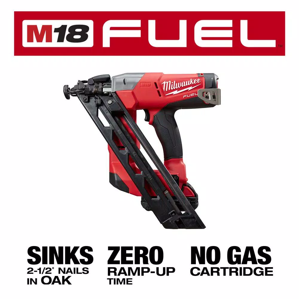 The M18 FUEL 15-Guage Finish Nailer delivers on the promise of peak productivity at your worksite, providing unmatched driving power, speed and efficiency – with practically no set up and minimal maintenance. Using the exceptional application speed, power and durability of our compact POWERSTATE Brushless Motor, plus our ready to fire cylinder design, this tool is capable of fully sinking 2 ½ in. nails into solid oak with zero ramp-up time. This 18-Volt nailer operates from the revolutionary REDLITHIUM Battery for unbeatable strength and run-time, eliminating the mess and cost of gas cartridges. It also includes REDLINK PLUS Intelligence, the most advanced electronic system on the market, to prevent damage to the nailer and battery from overloading and overheating. The M18 FUEL Nailer not only primes you for top performance; it also creates the experience of a pneumatic nailer that professional carpenters and remodelers expect, without the hassle of compressors and hoses.