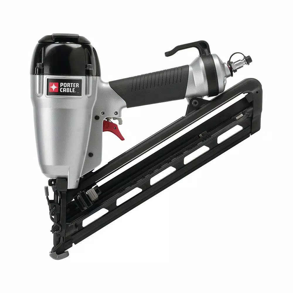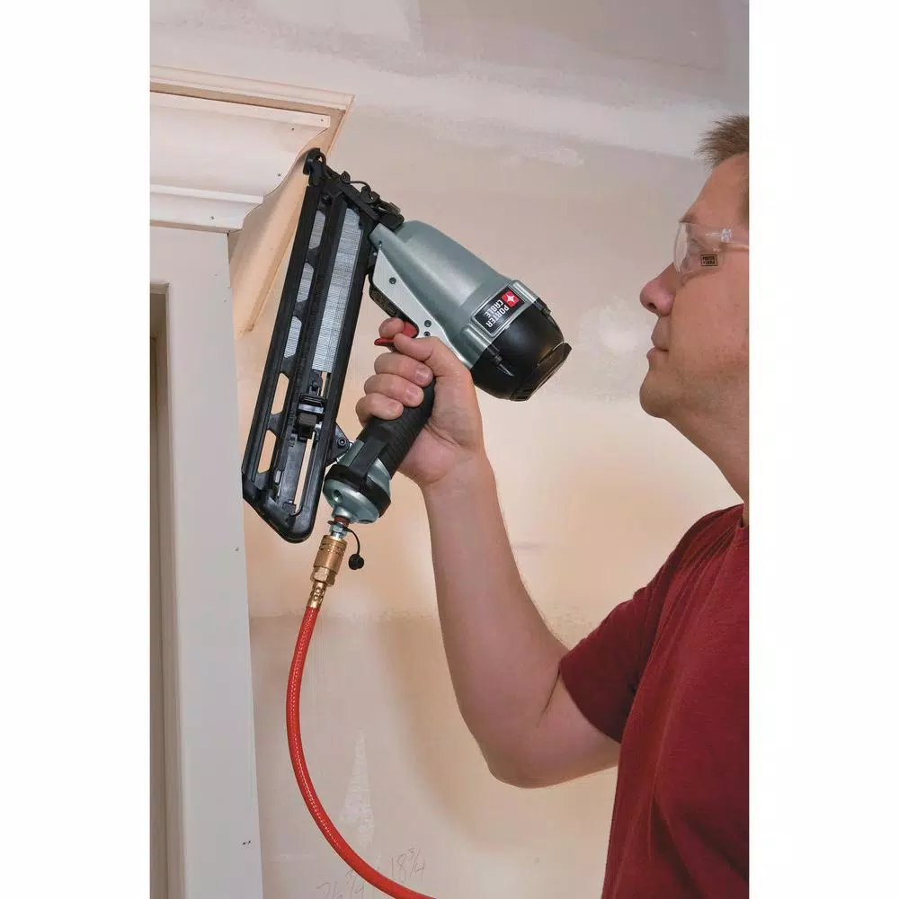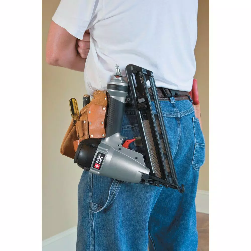 The Porter-Cable Pneumatic 2-1/2 in. 15-Gauge Strip Angled Finish Nailer Kit features a nailer with a compact body design for easy positioning and placement. An internal piston-catch mechanism keeps the piston at its initial position for consistent power and a non-marring nose tip with on-tool storage helps prevent ugly marks from nailing. The kit includes a nailer, case, finishing nails, 1/4 in. plug with cap, oil and operating manual.