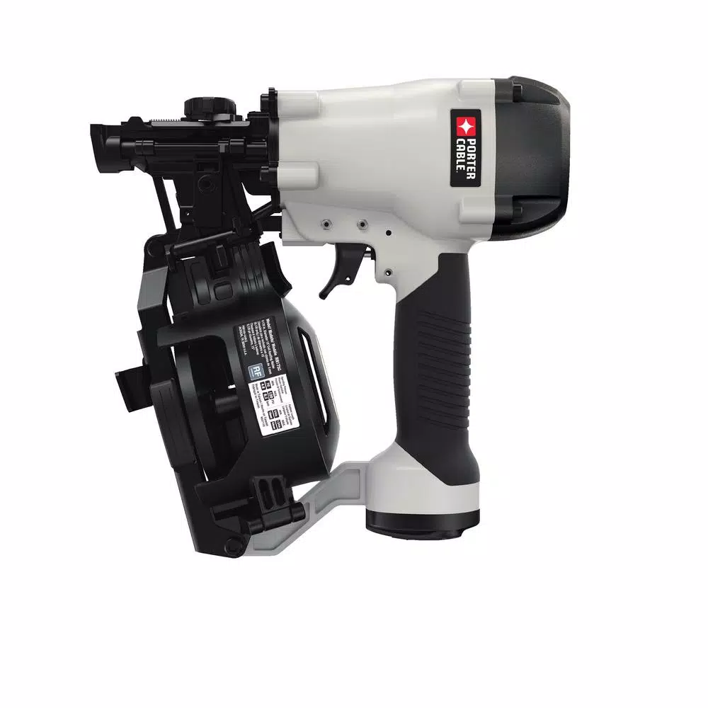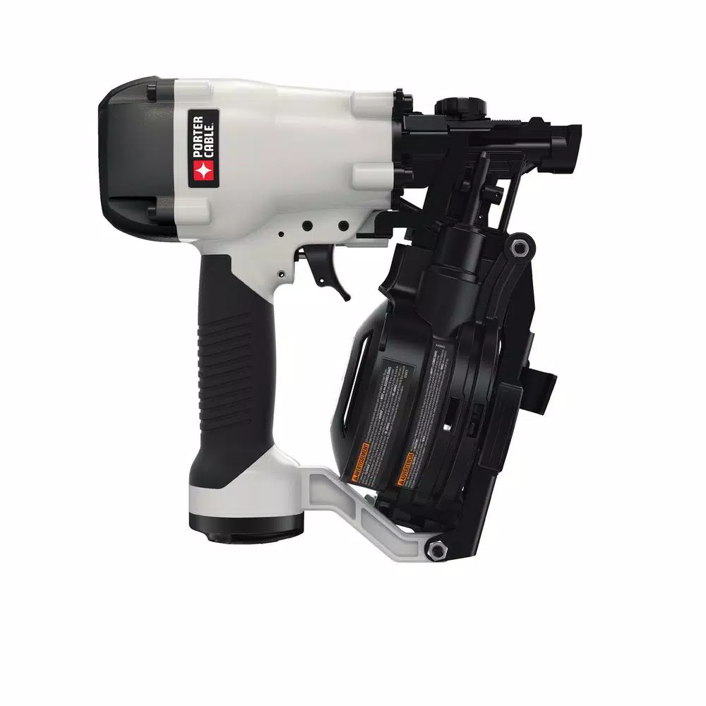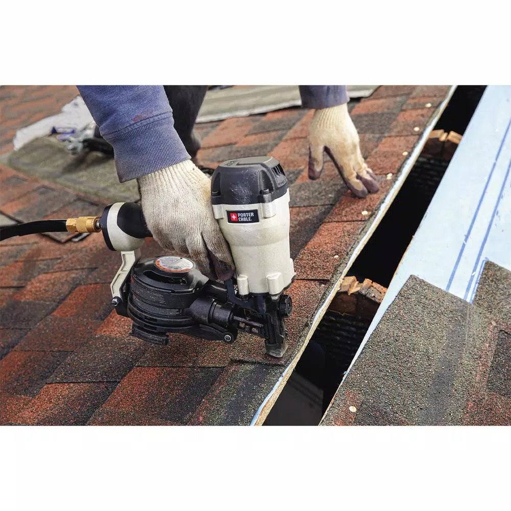 The Porter-Cable RN175C Coil Roofing Nailer is designed with a compact body for better balance and control. This nailer features an adjustable shingle guide and Quick-Set depth of drive that allow accurate and less damaging shingle placement. An over-molded grip and tool-free adjustable exhaust make this nailer more comfortable for extended use.