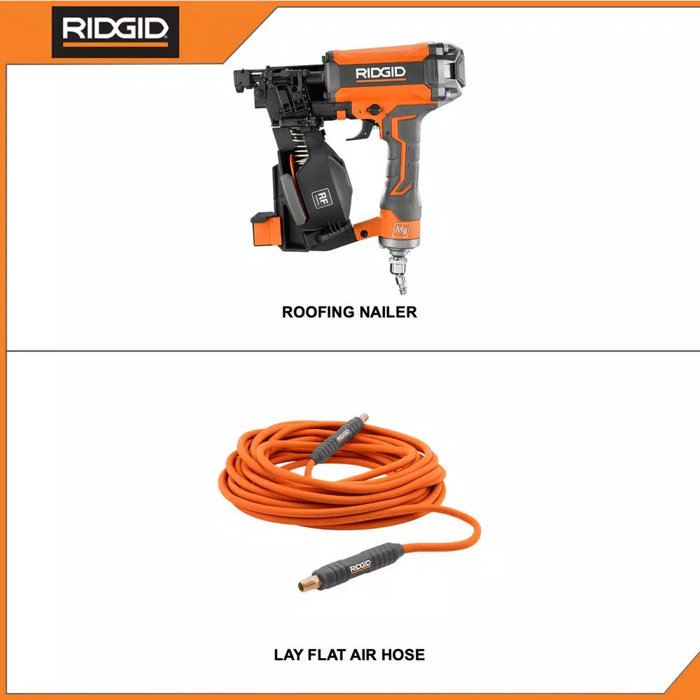 RIDGID introduces the 15-Degree 1-3/4 in. Coil Roofing Nailer with 1/4 in. 50 ft. Lay Flat Air Hose. The 15-Degree 1-3/4 in. Coil Roofing Nailer is a perfect combination of power, weight, and speed. Packed with FASTEN EDGE Technology, an industry leading feature set, this nailer can take on any roofing job. This tool is also backed by the Industry Leading Lifetime Service Agreement meaning FREE Parts. FREE Service. For LIFE. The Coil Roofing Nailer comes with a swivel connect, oil, hex key, no-mar pads, and an operator’s manual. The 1/4 in. 50 ft. Lay Flat Air Hose has a unique lay flat design that allows it to keep its shape, is kink resistant, and is non-tangling. At just over 3 lbs. for a 50 ft. hose, its lightweight design makes it easier for you to maneuver. Heavy-duty 360° swivel fittings with bend restrictors make the usual weakest point one of this hose’s strengths. Unlike other hoses, the Lay Flat Hose is able to flex in cold weather, which allows you to keep working regardless of your climate. Its 100% field repairable which saves you time and money in case of an accidental tear. With a 300 Max PSI capacity, the RIDGID Lay Flat Hose can be used for heavy-duty applications. The 1/4 in. 50 ft. Lay Flat Air Hose is warranted against defective parts and labor and includes 360° swivel fittings.