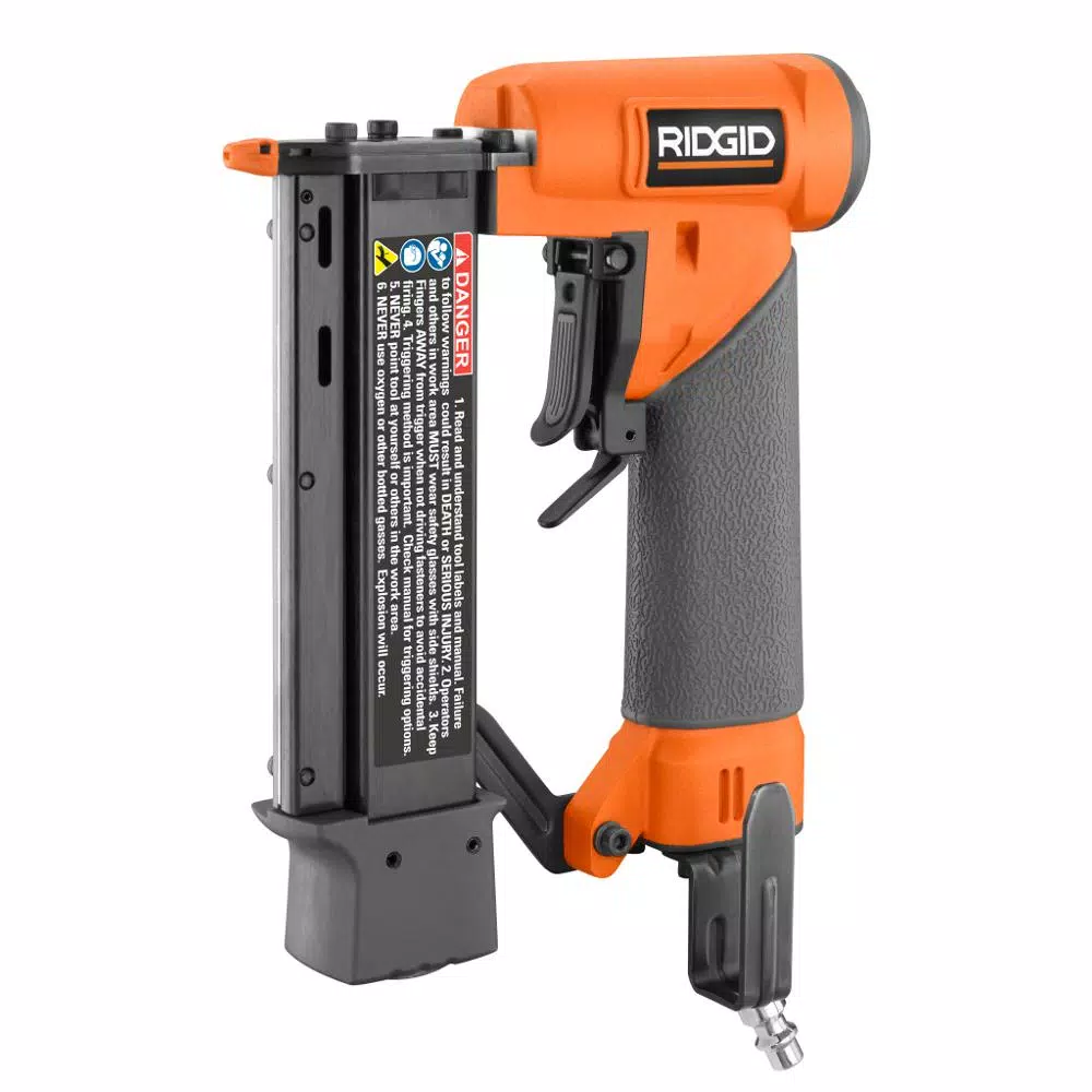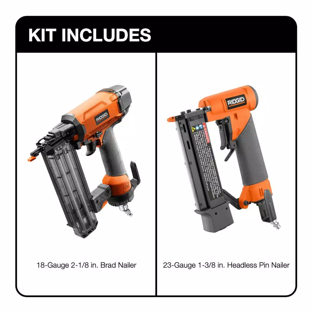 RIDGID introduces the 18-Gauge 2-1/8 in. Brad Nailer and 23-Gauge 1-3/8 in. Headless Pin Nailer 2-Tool Combo. The RIDGID 18-Gauge 2-1/8 in. Brad Nailer features an industry leading feature set with FASTEN EDGE Technology. It has a selectable trigger that can be set to contact or sequential fire. The magazine allows a wide range of fastener lengths and the internal piston catch delivers consistent driving power. It is designed for clean operation and long life and equipped with no-mar pads that help prevent scuffing or damage to the work surface. The RIDGID 23-Gauge 1-3/8 in. Headless Pin Nailer is a great choice for attaching molding, pinning joints and performing trim work, finish carpentry, and light wood assembly. This is the perfect nailer combination for anybody doing finishing projects. Backed by the Industry Leading Lifetime Service Agreement, this 2-Tool Combo includes the 18-Gauge Brad Nailer, the 23-Gauge Headless Pin Nailer, and an operator’s manual.