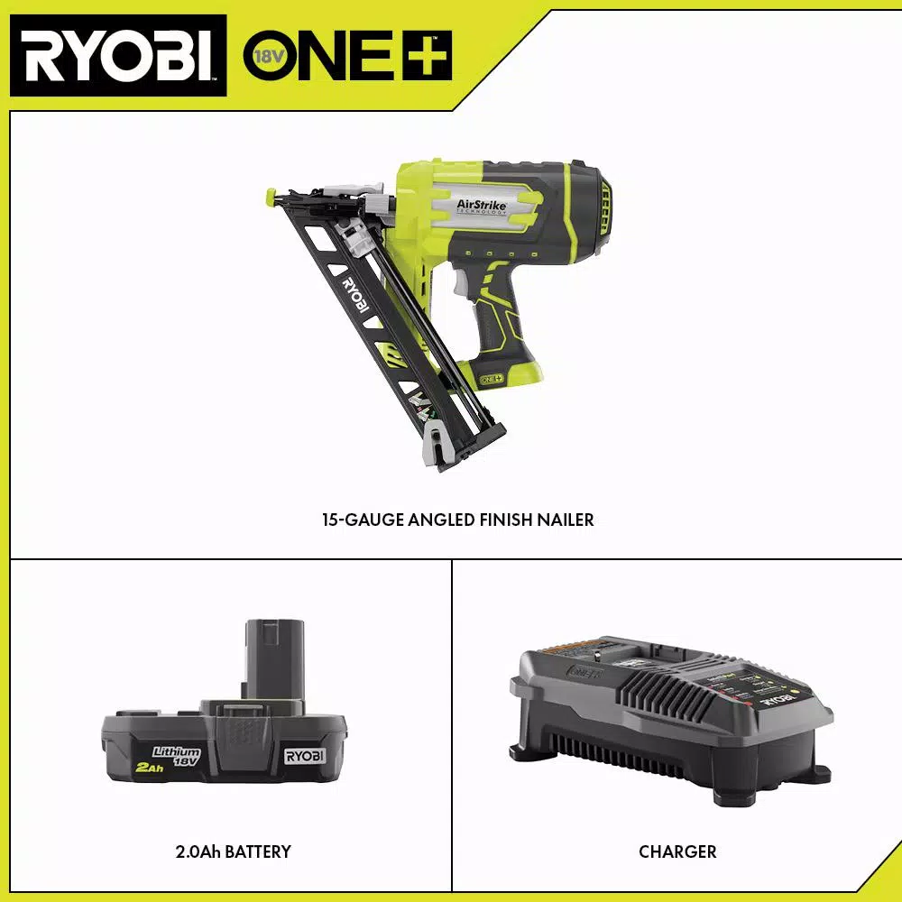 - Includes: (1) P330 18-Volt AirStrike 15-Gauge Angled Finish Nailer, sample nails, belt clip, (1) P190 18-Volt ONE+ 2.0 Ah Compact Lithium-Ion Battery, (1) P118 Dual Chemistry IntelliPort Technology Charger, and operator’s manual