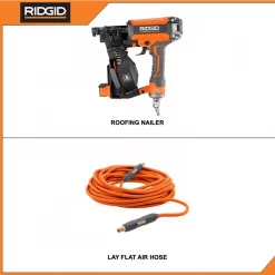Nail Guns RIDGID 15-Degree 1-3/4 In. Coil Roofing Nailer With 1/4 In. 50 Ft. Lay Flat Air Hose