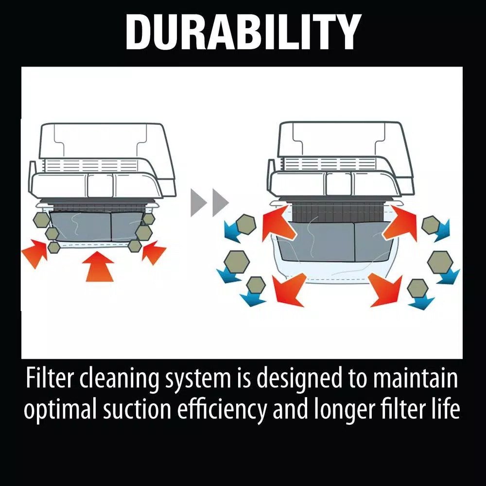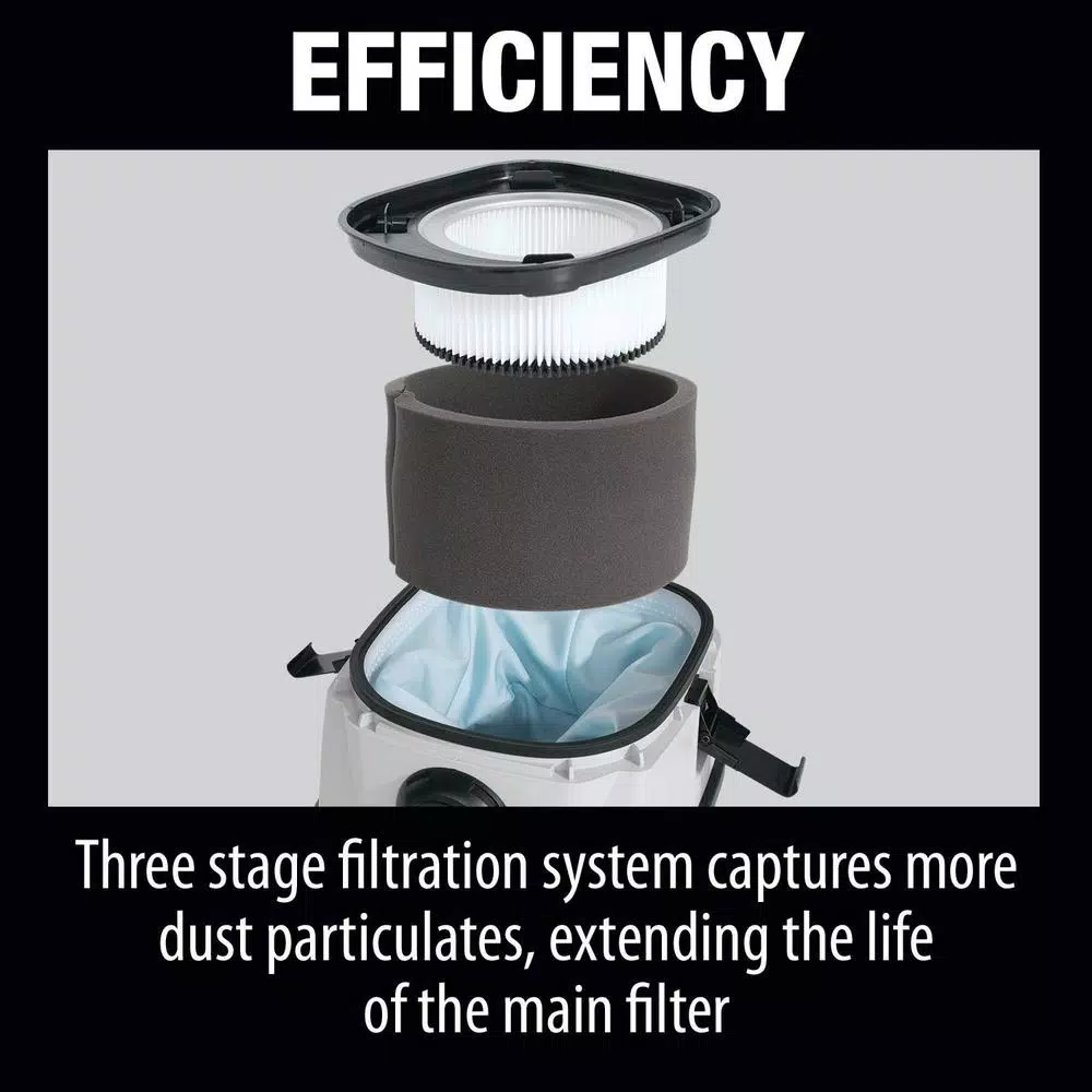 - Efficient three stage filtration system captures large, small and micro dust particulates extending the life of the main filter