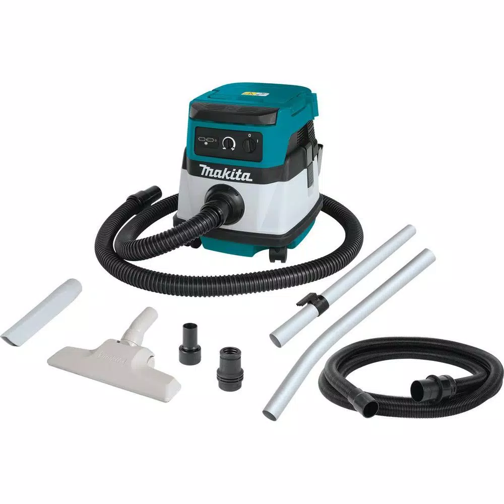 Clean-ups just got easier with the Makita 18-Volt X2 LXT Lithium-Ion (36-Volt) Cordless/Corded 2.1 Gallon Dry Vacuum. The XCV04Z (tool only) offers corded or cordless operation for maximum versatility and convenience. In cordless operation, the XCV04Z is powered by two 18-Volt LXT batteries for 36-Volt power and run-time, without leaving the 18-Volt LXT battery platform. Using two 18-Volt 5.0Ah batteries (sold separately), the XCV04Z delivers up to 65 minutes of continuous run time on low setting and 40 minutes on high setting, with 74 CFM and 36 in. water lift of suction. In corded operation, the vacuum delivers 74 CFM and 36 in. water lift. The 19.7 in. power cord combined with the anti-static hoses (1-1/2-Volt x 8 in. or 1 in. x 11 in., both included) provide extended range for efficient cleaning. The XCV04Z is engineered for efficient cleaning with a 3-stage filtration system consisting of a Pre-Filter Bag (captures larger dust particulates), Damper Filter (captures much smaller particulates) and Main Filter (captures micro particles). All three filter components are included. The XCV04Z is loaded with ease-of-use features. The over-size on-off switch, variable speed control dial, and dual L.E.D. battery indicators are clearly visible and easily accessible on the front of the vacuum. Additional features include quick-release metal latches, large rubber bumper, and rear casters with locking levers.
