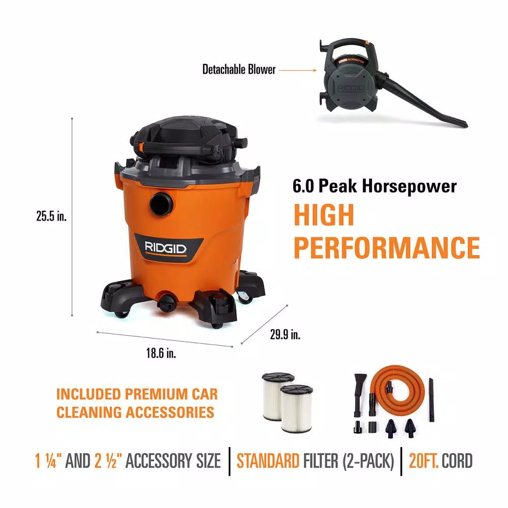 Part of the most powerful line of vacuums RIDGID has ever made. The RIDGID 12 Gal. NXT vacuum with detachable blower is a slim vac and unmatched in value – with the benefit of 2 tools in 1. RIDGID’s high performance 6.0-peak horsepower motor is engineered for the Pro who needs more power and highest performance. This vac also includes a premium auto cleaning detail kit with convenient tools for auto-detailing and additional cartridge filters. Replacement filters: VF4000 and Size A VF3502 Dust Collection Bags.