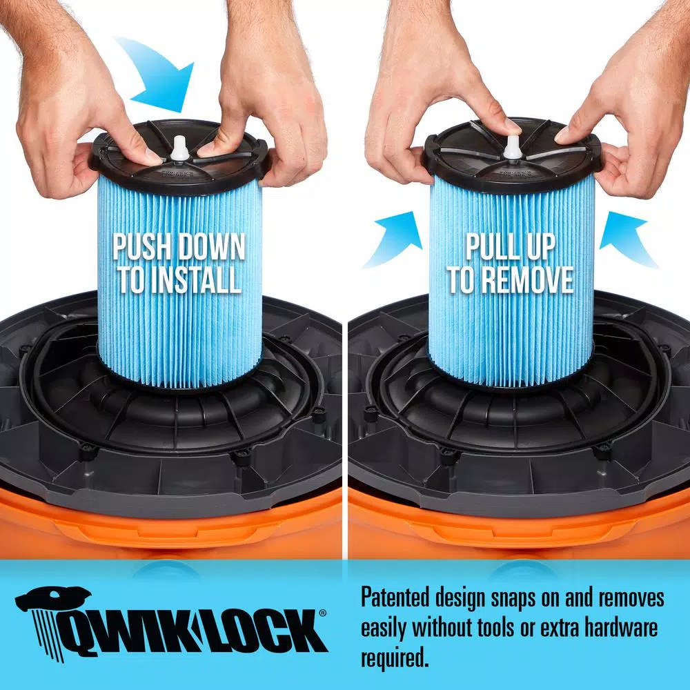 Part of the most powerful line of vacs RIDGID has ever made, the RIDGID 14 Gal. NXT wet dry vac is more powerful than ever with a 41% increase in performance. At 6.0 peak HP, this vac delivers the power required for tough cleanups. Its redesigned scroll technology gives this RIDGID NXT vac an increase in power, suction and lift. The 14 Gal. NXT vac includes the first ever 2-1/2 in. locking accessories that locks onto a wand or hose which means no downtime from attachments coming apart. The blower port adds versatility and allows you to use hose to blow leaves, grass clippings and more. This vac features our patented Qwik Lock Filter that makes installing or removing your filter quick, easy and secure. This vac also includes a premium auto cleaning detail kit with convenient tools for auto-detailing. Replacement filter VF5000, and Size A VF3502 dust collection bags sold separately.