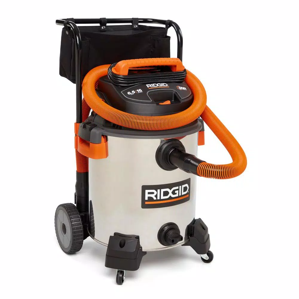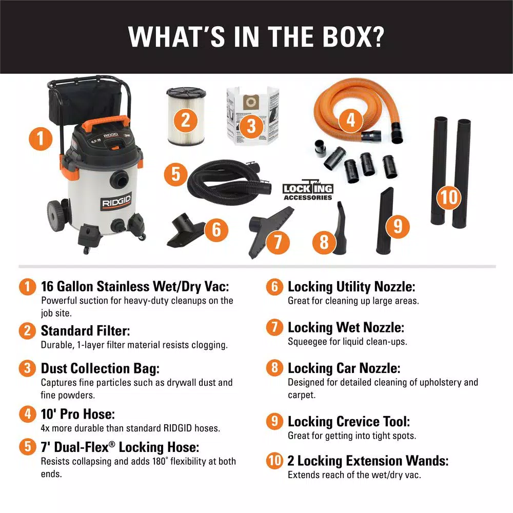 This RIDGID 16 Gal. stainless steel wet dry vac is designed to deliver the powerful suction, large capacity, rugged construction, unique features and excellent mobility that pros demand for the jobsite or shop. The powerful 6.5 peak HP motor easily handles the toughest jobsite clean-up tasks. This stainless steel vac includes the first ever 2-1/2 locking accessories. All locking accessories (hoses, wands, and accessories) lock together, so nothing falls off in use. A 3-layer fine dust filter, VF5000 captures drywall dust. Moving up and down steps or across rough terrain is a snap with the large fixed rear wheels and cart handle. This stainless steel construction wet/dry vacuum also features RIDGIDs Scroll Noise Reduction for quiet operation. Included is a 10 ft. Pro-Hose that is kink-resistant and provides extra-long reach.