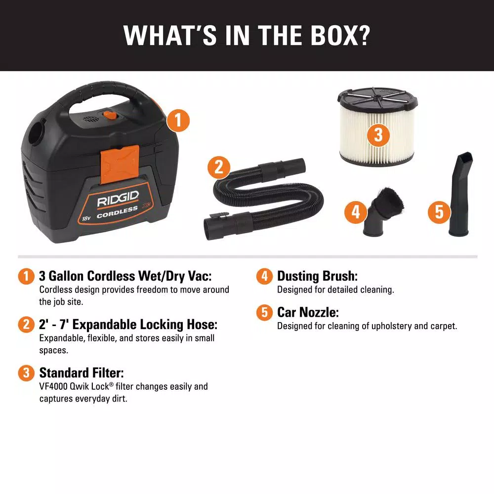 Now there’s a portable wet dry vac that pretty much works anywhere, especially where plugs don’t. The battery-powered, cordless wet dry vac from RIDGID is perfect for car cleaning and jobsite debris or anywhere that’s away from an outlet. This 3 Gal. wet/dry vacuum adapts to the existing 18-Volt RIDGID power tool battery system and is loaded with built-in accessory storage. A 1-7/8 in. locking hose that expands to 7 ft. , dusting brush, cartridge filter and car nozzle are included. It’s the most powerful cordless wet dry vac period. Everything you need to attack water and debris with a vengeance. It works best in places plugs never will. Battery and charger Sold separately; use VF3500 as a replacement filter.