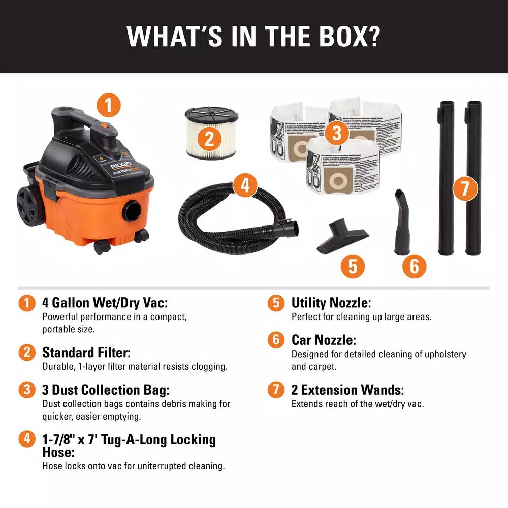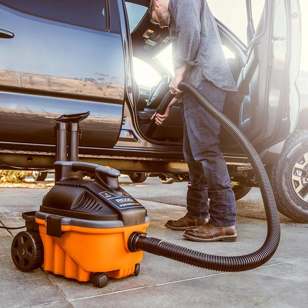 This RIDGID 4 Gal. wet/dry vacuum has a 5.0-peak horsepower motor that offers the powerful performance necessary to tackle even the messiest projects. The 20 ft. cord provides an extensive reach and the 18 lbs. design is lightweight and easily portable. The wet/dry vacuum has large rear wheels and casters that provides great mobility over carpeted floors, thresholds and rough floors at jobsites. The included dust collection bags keep dirt and debris contained for no mess disposals. This is an ideal vacuum for car cleaning.