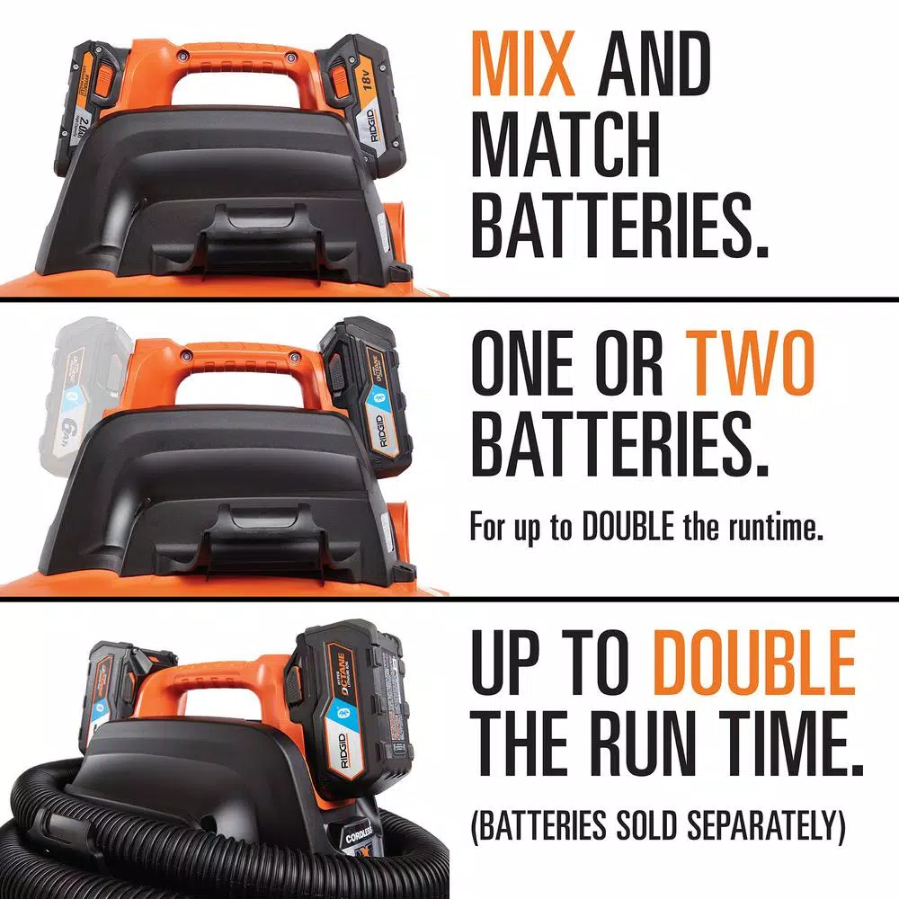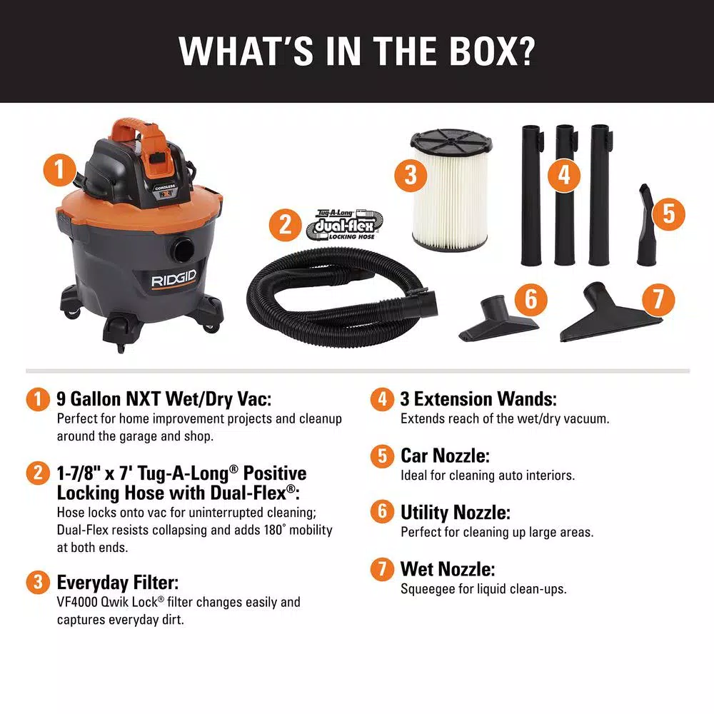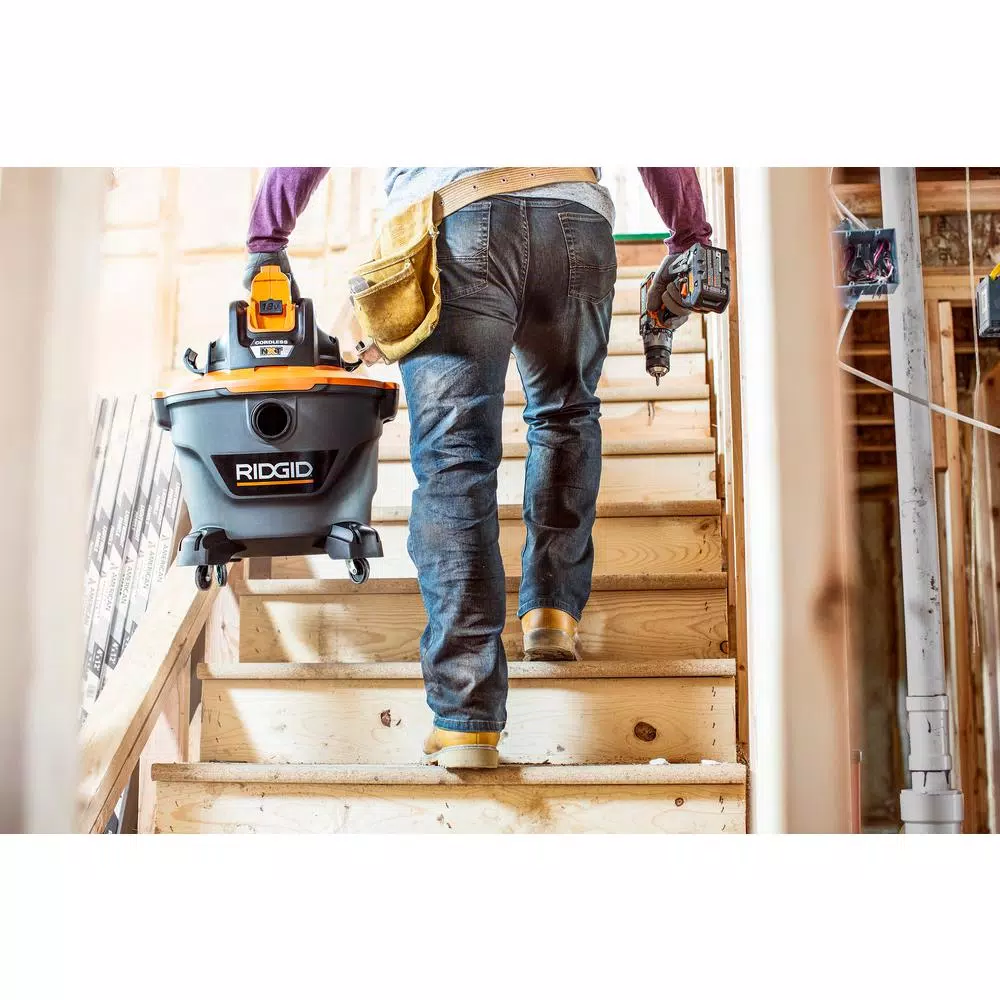 RIDGID’s 18-Volt 9 Gal. cordless wet/dry vac takes cordless convenience and puts it in a full sized form. Cordless power is perfect for car cleaning, jobsite debris or anywhere that’s away from an outlet. Its performance rivals its 9 Gal. corded counterpart, and with the option to use 2 batteries (sold seperately), you can effectively double the runtime you’d expect from other cordless wet/dry vacs. Its full-sized design lets you run continuously without having to stop and empty frequently. Included hose and accessory storage means this unit compactly stores in the home or garage. Replacement filter VF4000 and replacement dust bag VF3503, both sold separately.