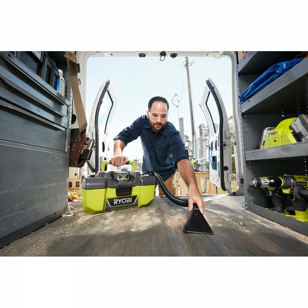 RYOBI introduces the 18-Volt ONE+ 3 Gal Project Wet/Dry Vacuum with Accessory Storage. Equipped with both wet and dry capability, this vacuum has 3 Gal. of dry debris capacity. This versatile vacuum doubles as a directional blower and includes a utility accessory that attaches directly to the exhaust output for a quick and easy change from vacuum to blower. The 6 ft. x 1-1/4 in. extendable hose is transparent, giving you optimal visibility of debris as it is vacuumed, and the pivoting air inlet port makes for easy hose management. The Project Vacuum has a Flat-top design for convenient stacking and storage. Best of all, this kit is part of the RYOBI ONE+ System of over 175 Cordless Tools that all work on the same battery platform. Backed by the RYOBI 3-Year Manufacturer’s Warranty, the 3 Gal Project Wet/Dry Vacuum includes onboard storage for the included washable filter, crevice tool, utility nozzle, hose, and operator’s manual. Battery and charger sold separately.